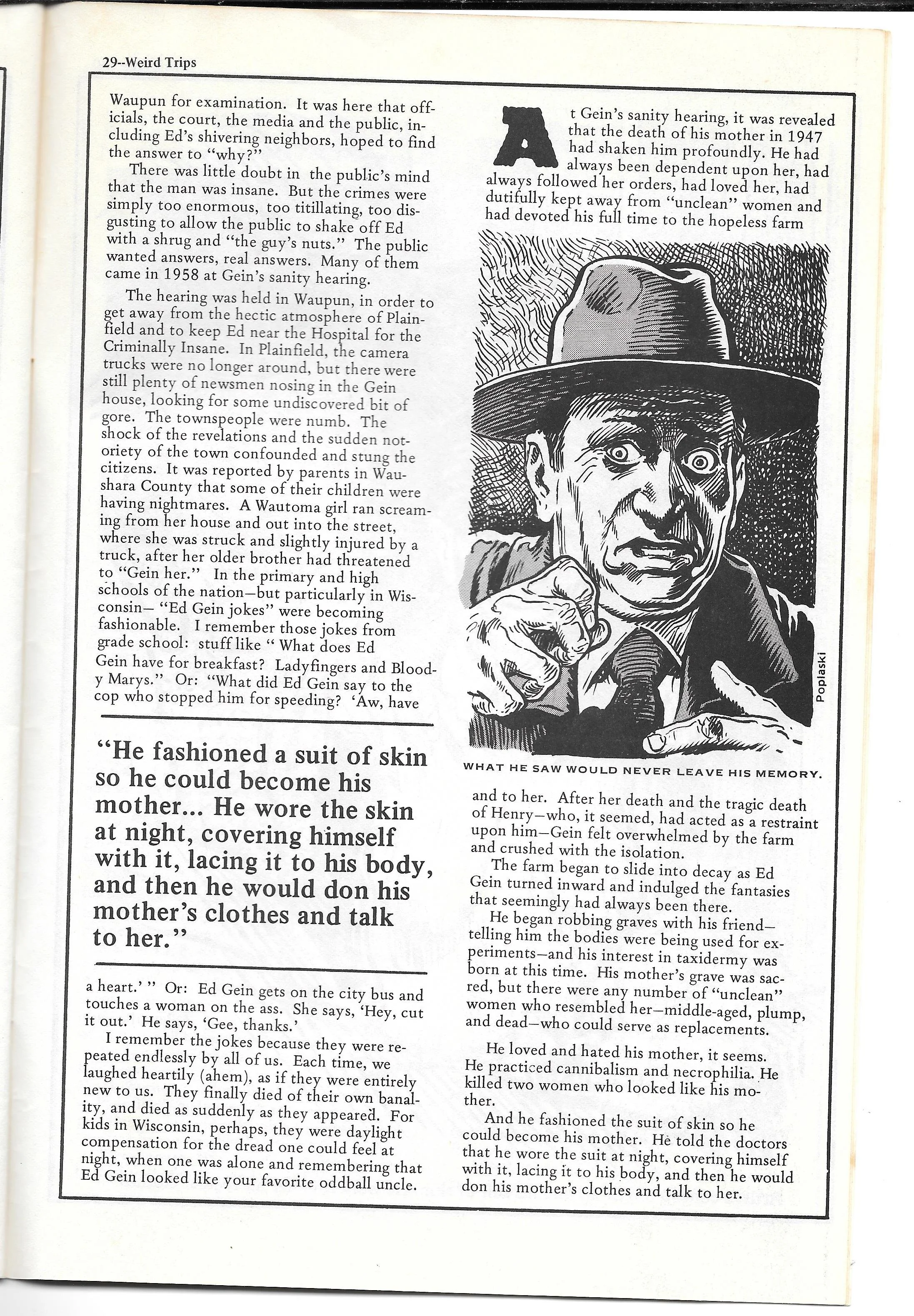 With a famous cover by William Stout (featured in Return of the Living Dead (1985), the same movie Stout designed zombies for) Weird Trips 2nd - and final! - issue presented an in-depth look at Eddie Gein and his crimes c/o David Schreiner. With the issue now fetching sky high prices it seemed about time to make the written piece available to all Gein fans without the extortionate price tag.